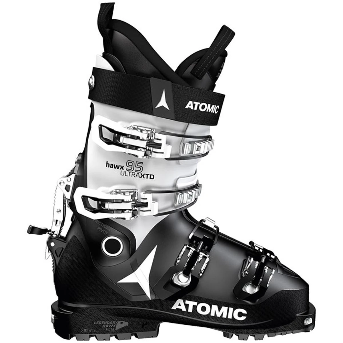 The Atomic Hawx Ultra XTD 95 W CT GW is a versatile ski boot for all-mountain skiing and freeride touring. This boot delivers the same legendary feel, skiing power and all-mountain capability of Hawx yet with the epic natural movement of Backland. Besides Prolite construction – with reinforcement in all the right places for epic alpine performance – it has a Free/Lock 2.0 mechanism to switch between ski and walk mode and Frictionless Pivot for natural movement and easier ascending. Complete Tech inserts in both the toe and heel allow for maximum binding compatibility. With a slightly softer plastic construction than the top-end Hawx Ultra XTD 115 W, this boot is especially tuned for women skiers of medium/small build and strength. All mountains, one boot!